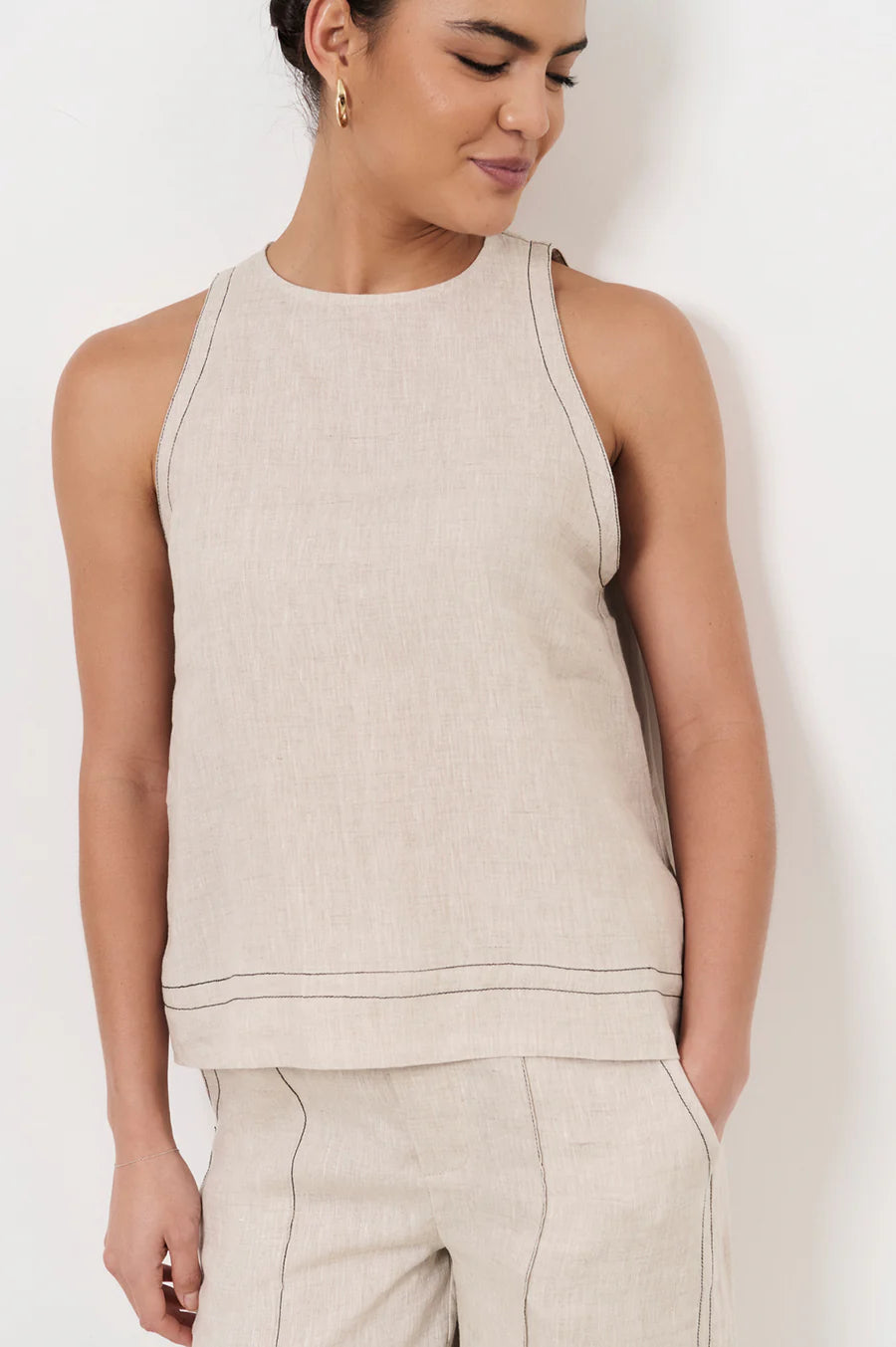 Refresh your wardrobe with the Kensley Contrast Stitch Linen Top in Natural. Crafted from 100% breathable linen, this sleeveless top offers a relaxed, comfortable fit perfect for warm weather.