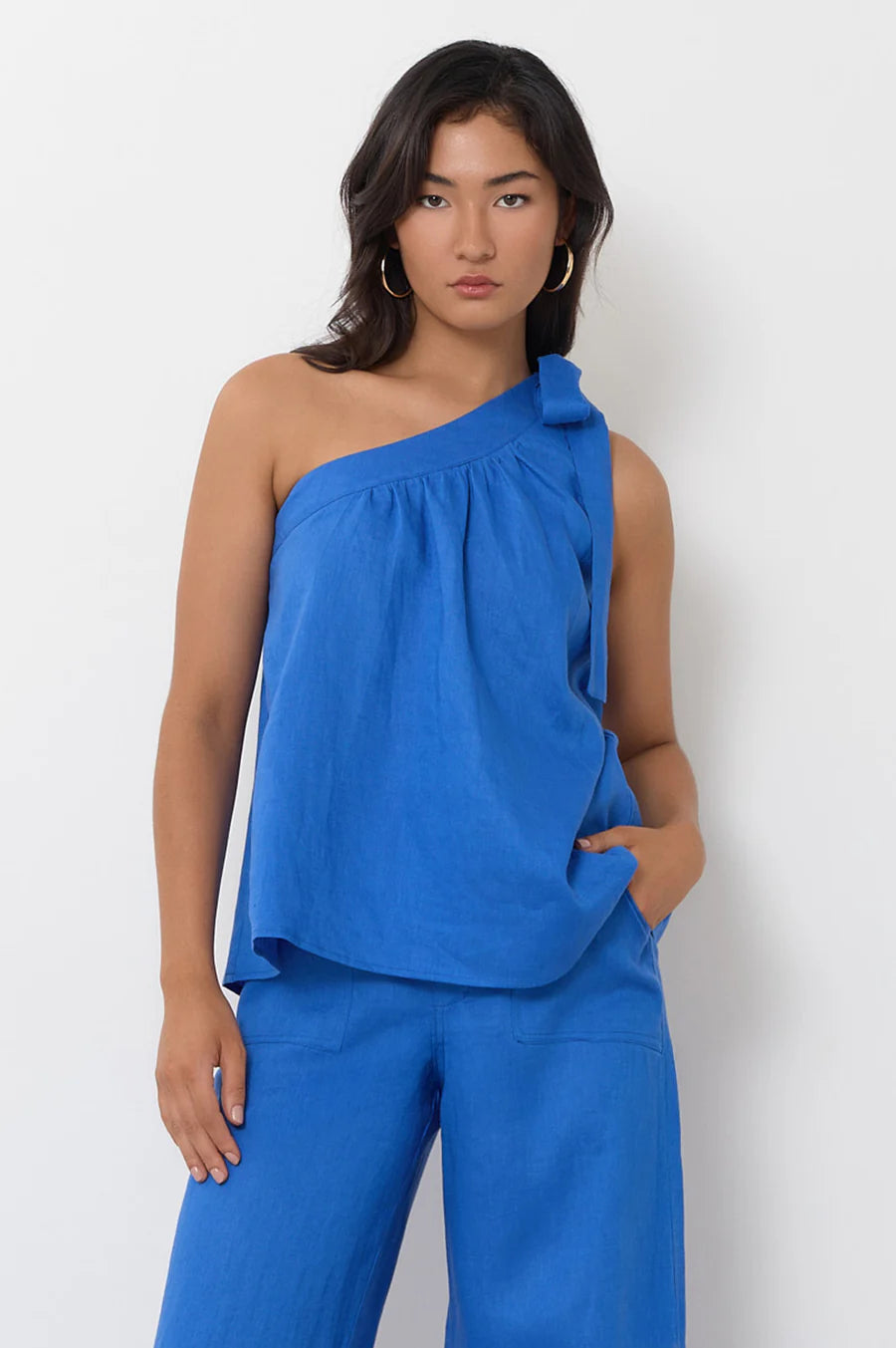 The Frida One Shoulder Tie Linen Top is a modern statement piece crafted from 100% breathable linen in a fresh blue hue. Designed in a relaxed silhouette, this top features an adjustable tie shoulder for a custom fit and an elasticised back for added comfort and ease of wear.