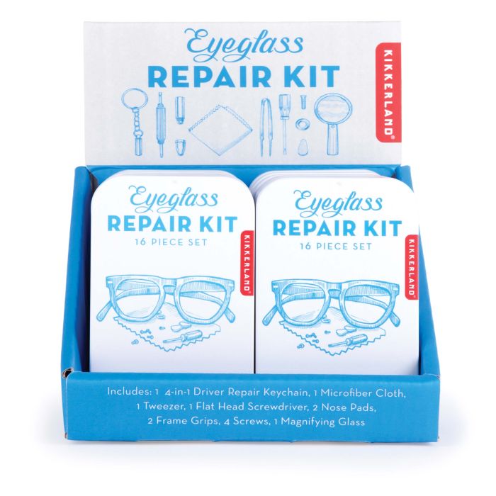 quick and easy eyeglass maintenance. Housed in a handy tin, this all-in-one kit includes everything you need for minor repairs and adjustments, whether at home or on the go.
