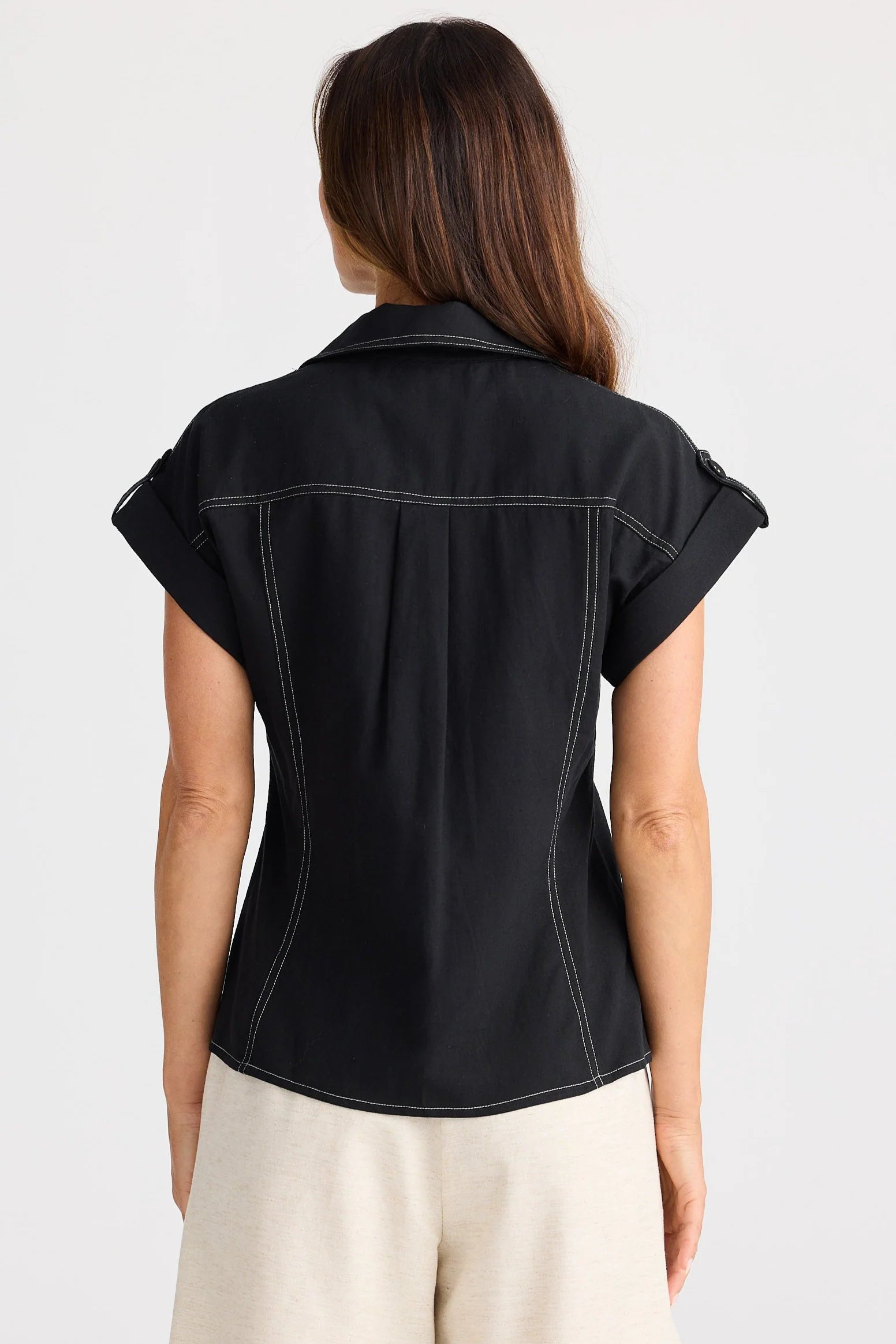 Effortlessly blending structure and ease, the Portia Shirt is a timeless staple with a modern edge. Designed with an open collar and button stand, it features cuffed sleeves with button tabs for versatile styling and practical chest pockets that add a casual-chic touch. The contrast topstitching enhances its clean lines, making it a standout piece for both work and weekend wear.