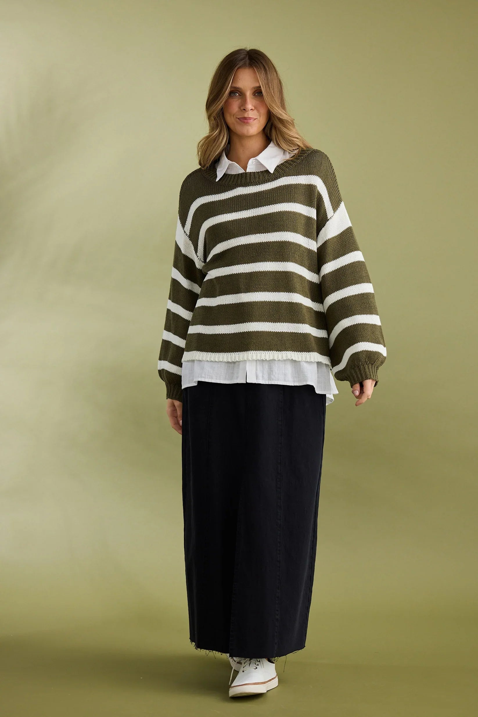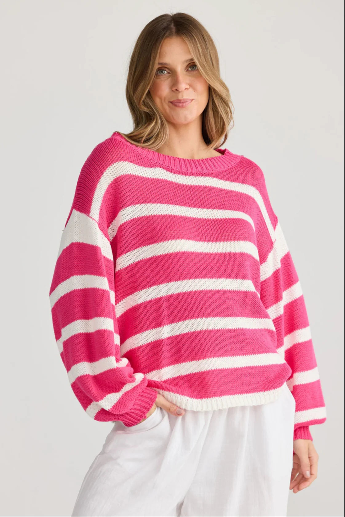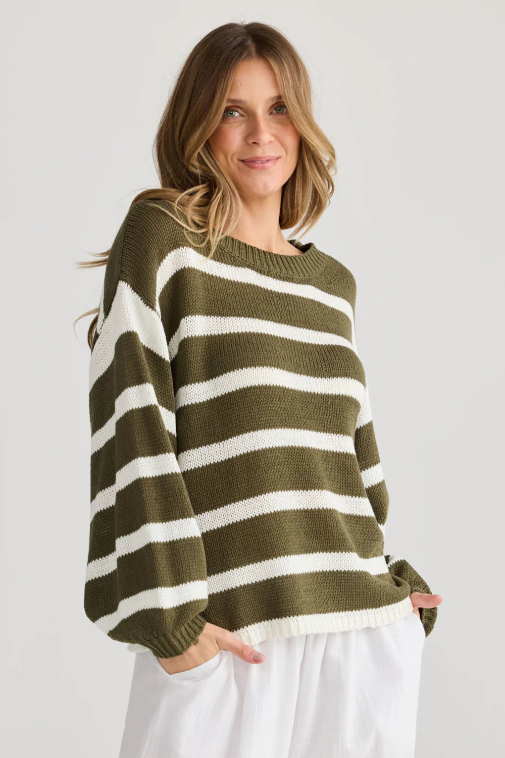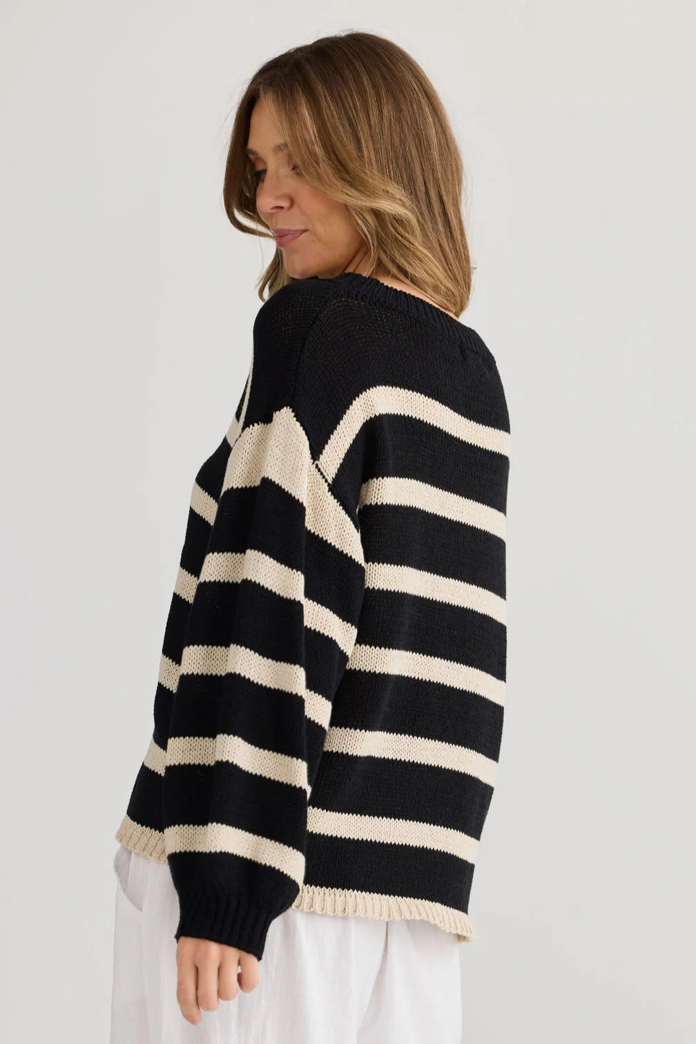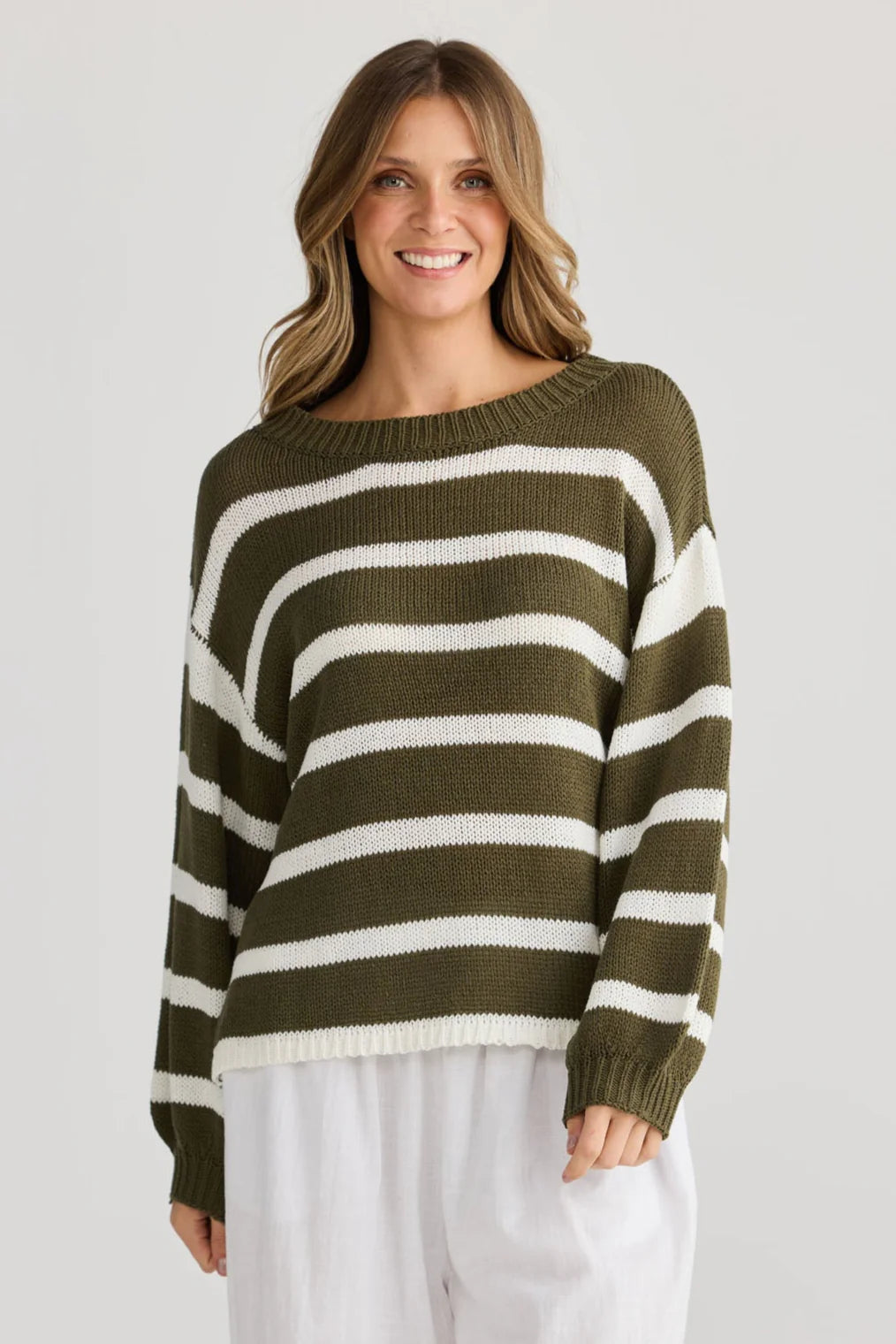 Elevate your everyday wardrobe with the Driftwood Knit Jumper with Natural Stripes. This timeless striped knit features a relaxed drop shoulder design, round neckline, and long sleeves with ribbed cuffs for ultimate comfort and laid-back style. Perfect for layering through cooler months or wearing on its own, this versatile jumper offers effortless charm with a modern edge. Pair it with your favourite jeans or tailored pants for an easy, chic look.