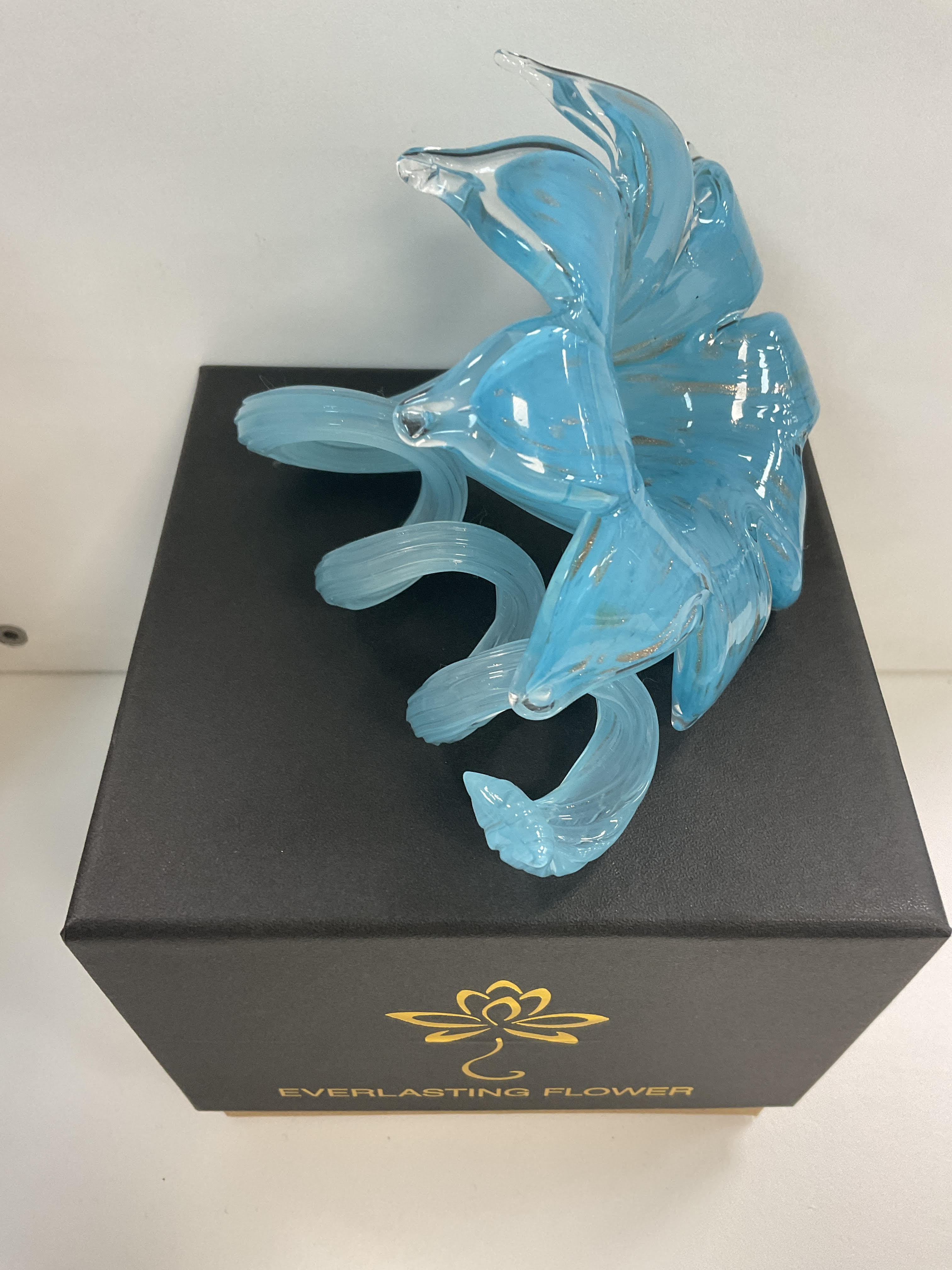 Indulge in the timeless elegance of our handcrafted Blue Glass Everlasting Flower. This unique piece, meticulously mouth-blown by skilled artisans, is a stunning expression of love, friendship, and admiration.