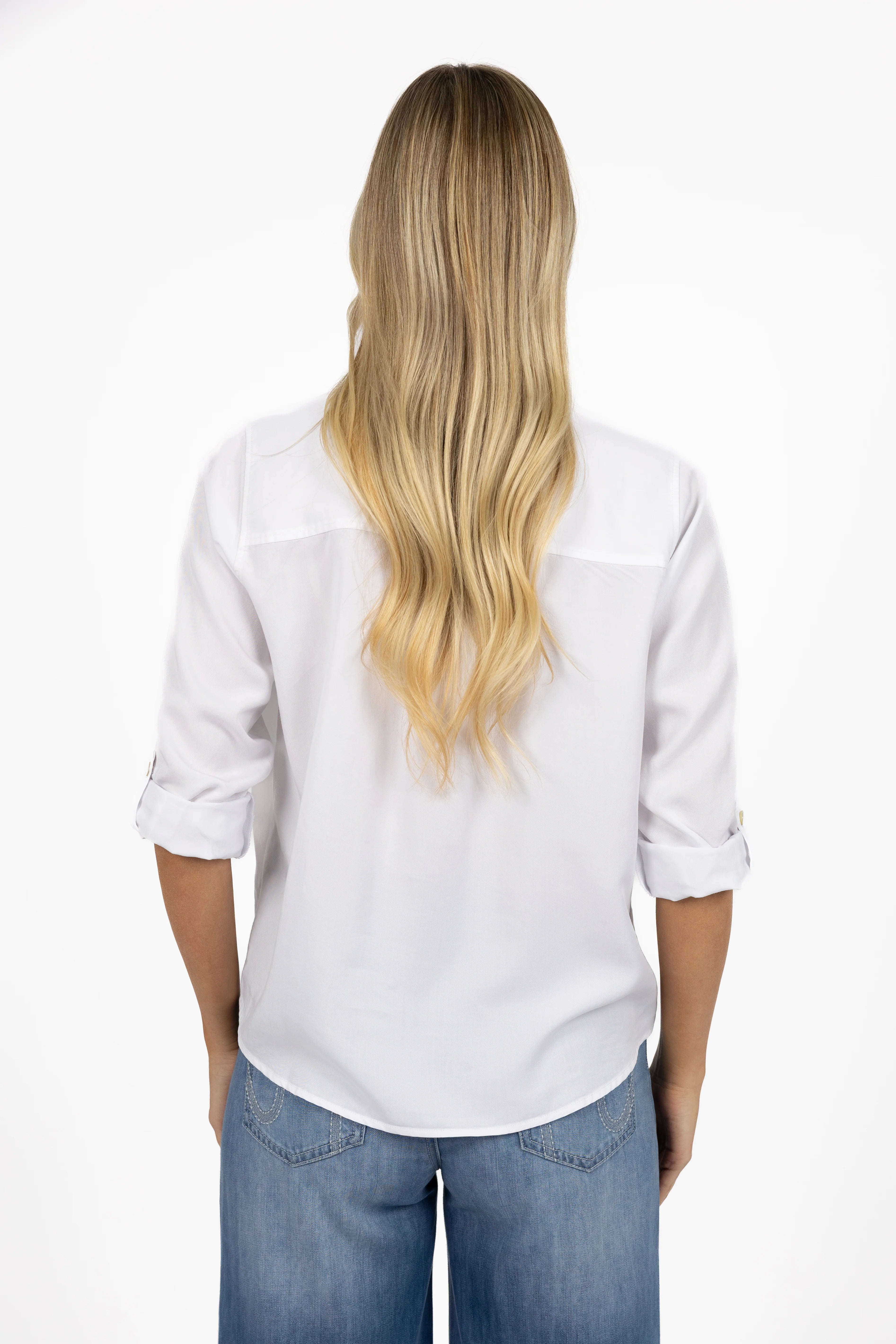 Featuring a collared V-neckline, shell button details, and a front patch pocket, the Leni Shirt combines relaxed tailoring with subtle sophistication. Its straight, roomy fit and curved hemline offer easy movement and a flattering drape, while the full-length sleeves with split and button cuffs allow you to roll them up or wear them down for versatile styling.