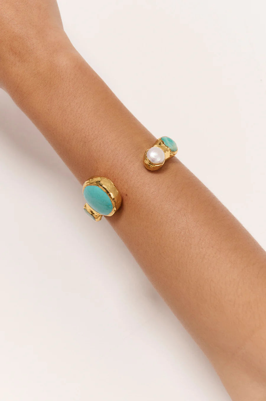 Crafted from stone, pearl, and plated metal, the bracelet offers a stylish and elegant accessory for event wear or special occasions. Its open cuff design ensures a comfortable fit while adding a touch of luxury to any outfit.