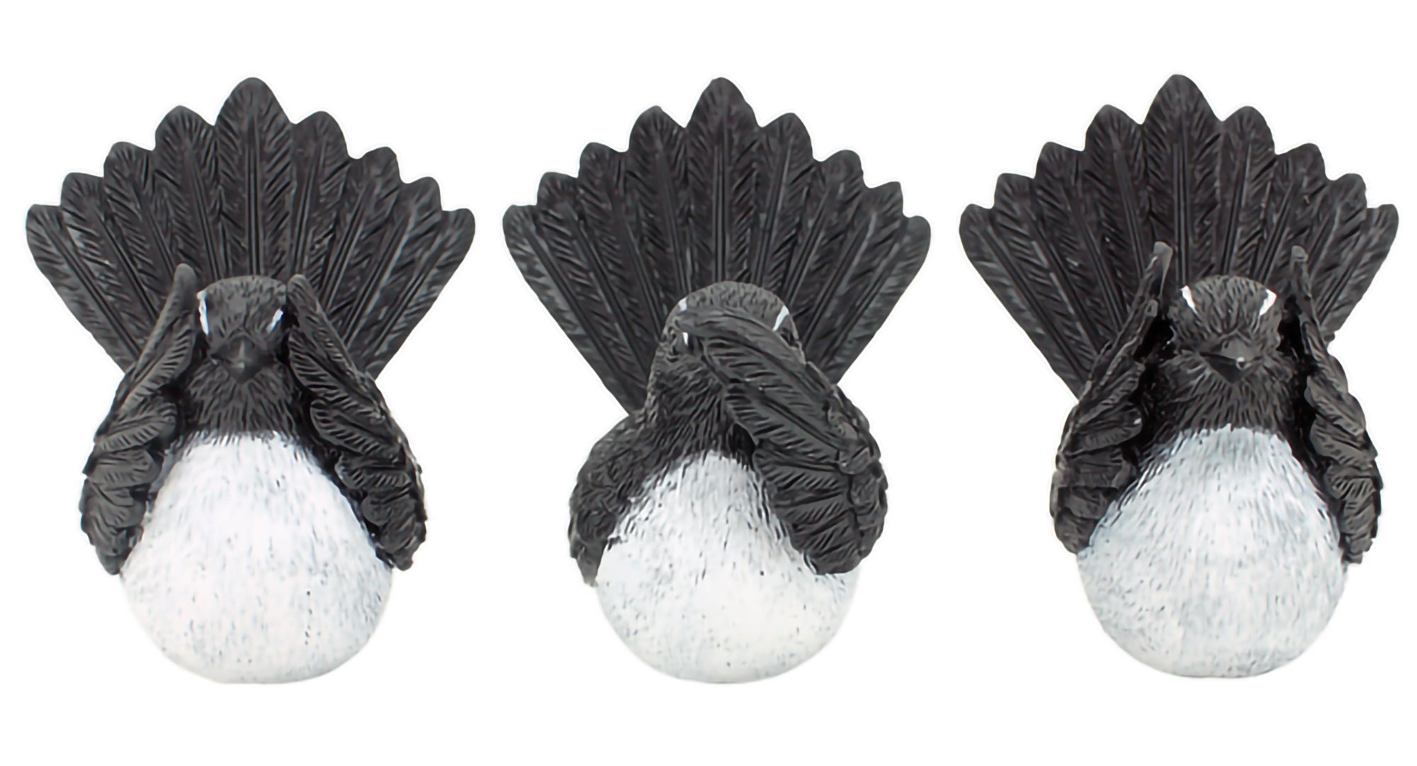 Set of wagtail figurines inspired by “See Hear Speak No Evil”