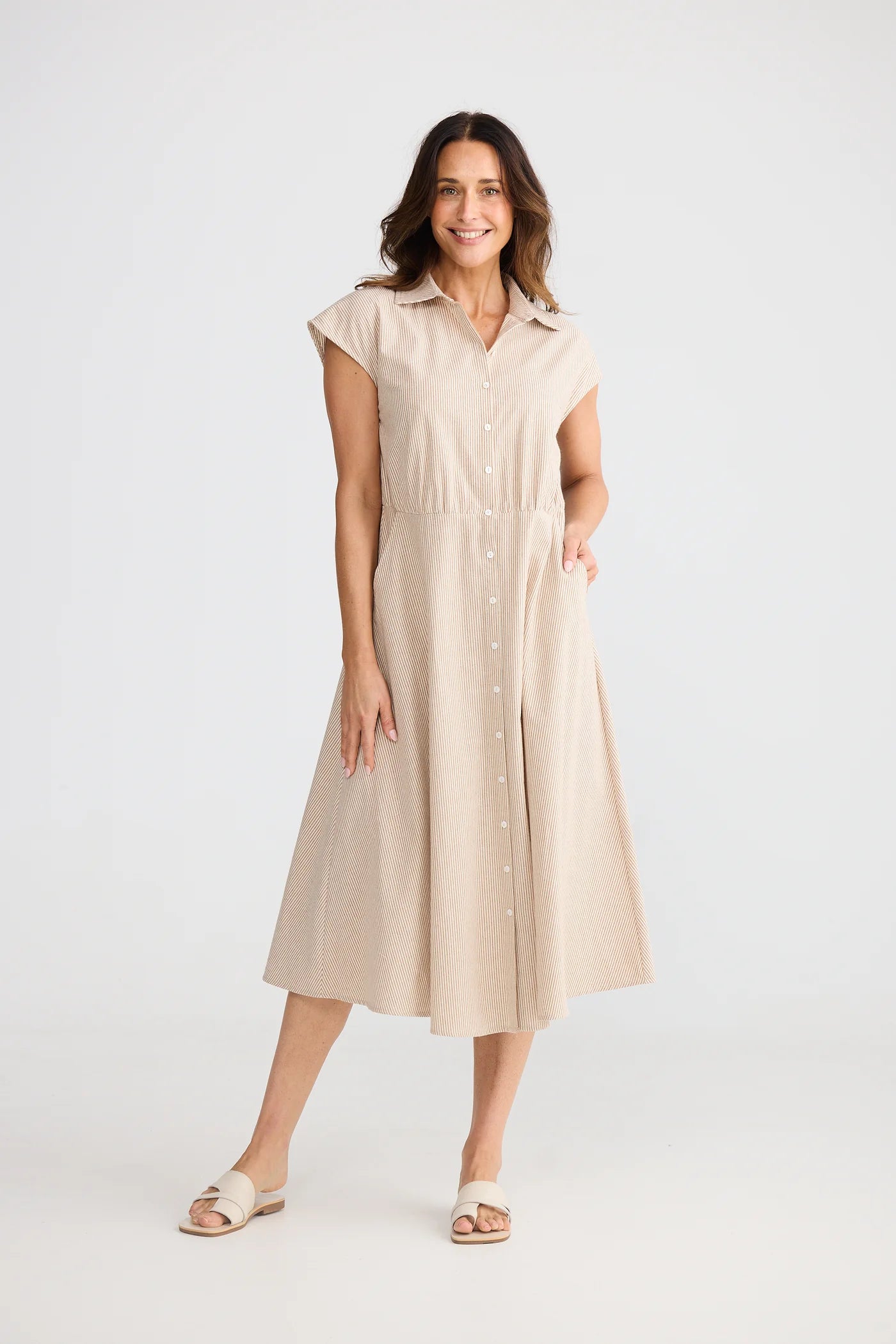 Effortlessly stylish and endlessly wearable, the Musings Dress is a timeless wardrobe staple designed for everyday comfort and ease. Featuring a classic collared neckline and button-down front, this midi-length dress offers a relaxed yet polished silhouette. The dropped shoulders add a modern touch, while side pockets bring practicality to this versatile style.