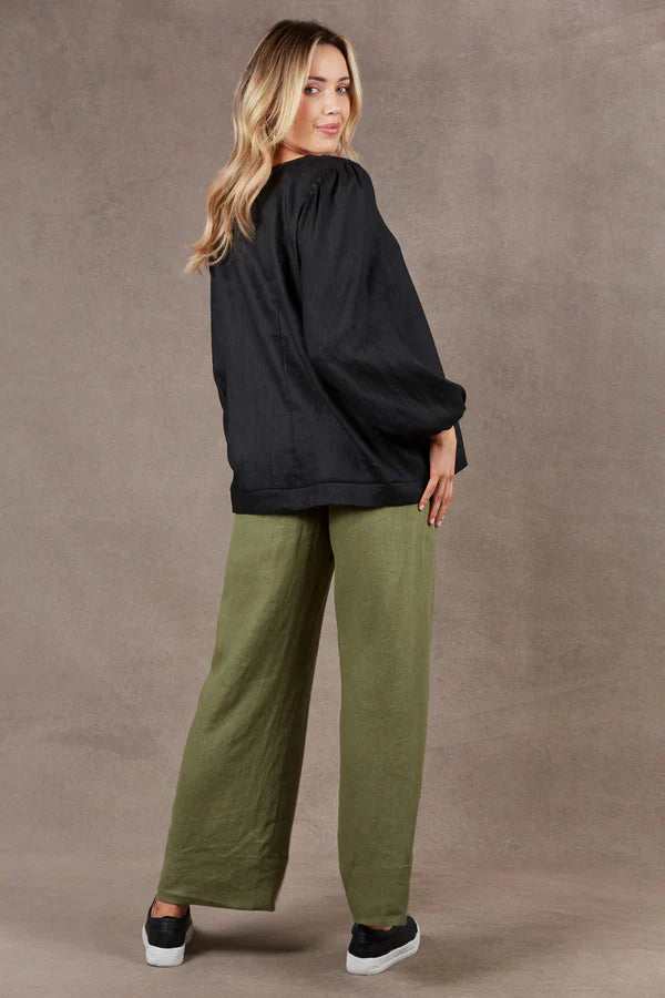 The Nama Top Ebony, crafted from 100% linen, embodies casual elegance. Its scoop neck, long balloon sleeves, and relaxed hem create a sophisticated silhouette suitable for work, date night, or a day out shopping. Pair this lightweight top seamlessly with leggings or fitted denim and ankle boots for a chic look.