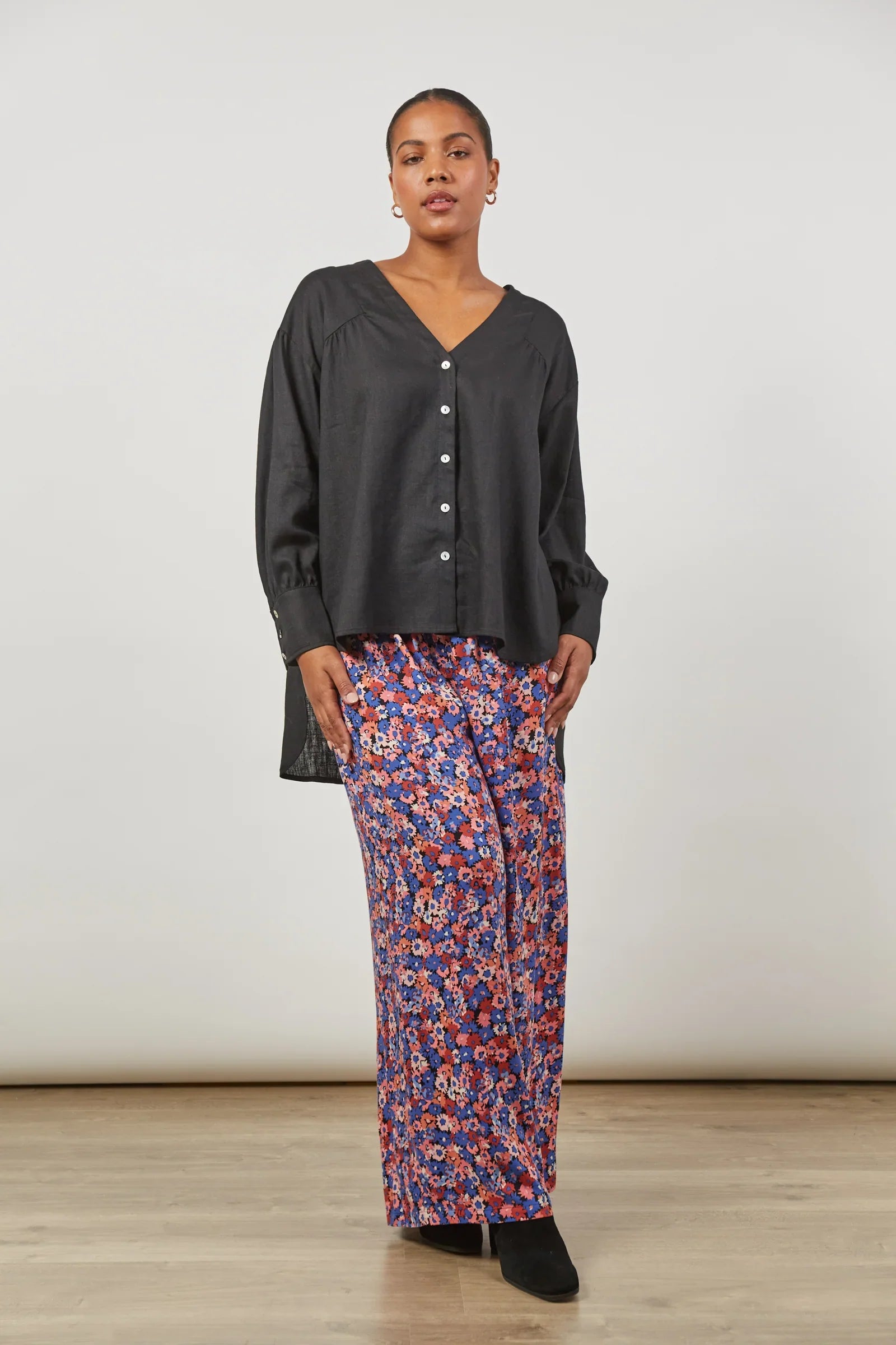 Meet your new favourite basic: the Panorama Blouse Onyx. Light and breezy, our updated classic linen shirt offers a roomier fit and hip-length silhouette. Crafted from a linen-cotton blend, it features a flattering V-neck, dropped shoulder, and a curved high-low hem. Transition effortlessly from sophisticated to relaxed by wearing it loosely over wide-leg pants with sneakers or loafers.