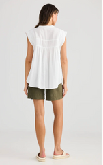 Elevate your wardrobe with the effortless charm of the Clementine Top. Crafted from 100% cotton, it blends breathability with a soft, natural feel—ideal for everyday wear or warmer days. The design marries classic structure and feminine detail: a delicate band collar with button-through front, a gathered front & back yoke, and subtle ruched accents that add texture and visual interest. Short sleeves keep it versatile and easy to layer.