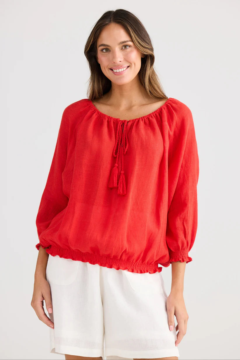 Crafted from 100% linen, the Seaside Top Red by Holiday Trading Co combines timeless style with breathable comfort. The natural linen fabrication offers a lightweight, airy feel that’s perfect for warm-weather days. Effortlessly versatile, it pairs beautifully with vacation shorts or relaxed trousers for easy coastal style. Designed for comfort, durability, and natural elegance, this top keeps you cool and comfortable wherever your travels take you.