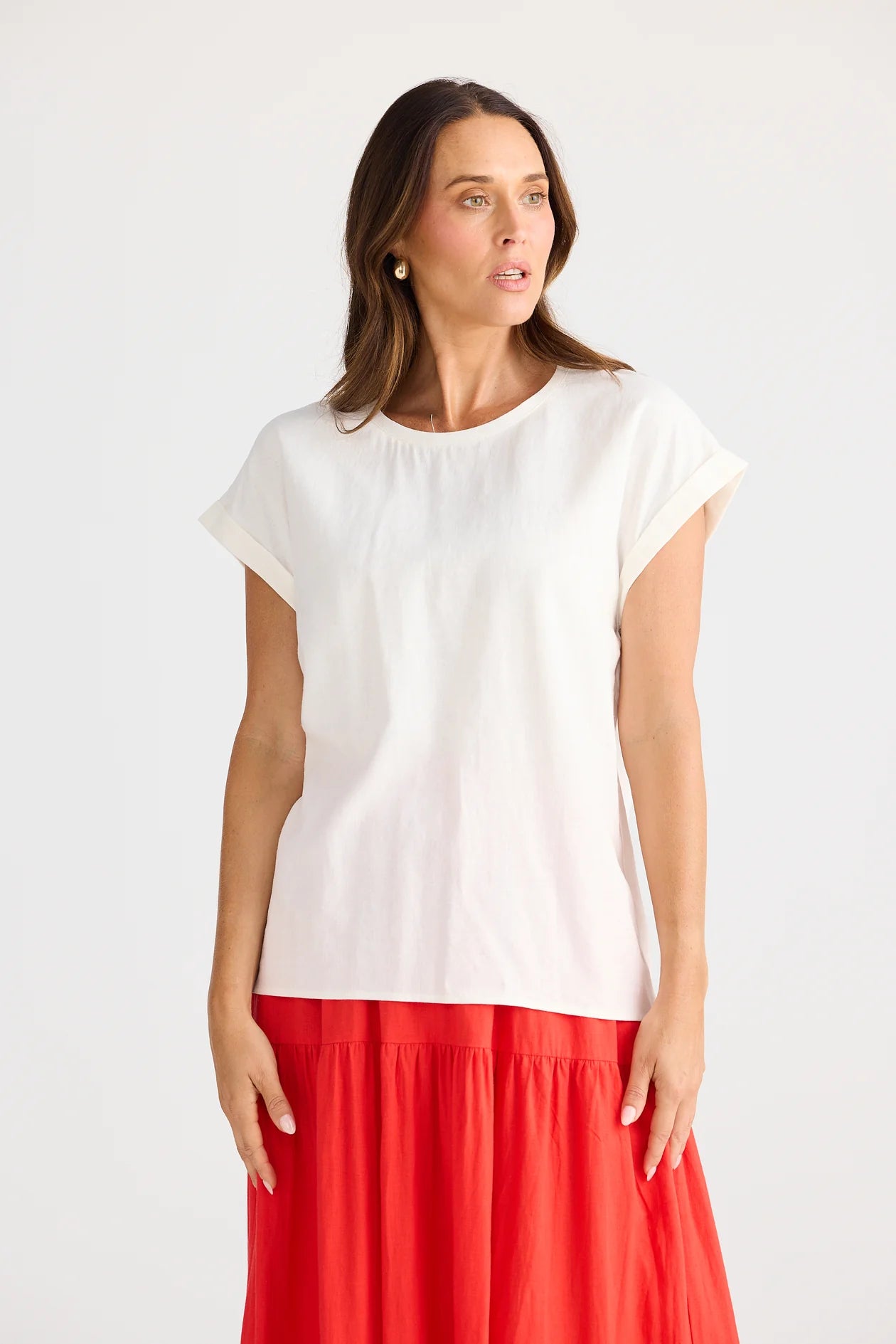 Simple, versatile, and effortlessly chic – the Percy Top is the perfect everyday essential. Designed with a classic round neckline and capped sleeves with a turned cuff, it offers a clean and modern look with just the right touch of detail.