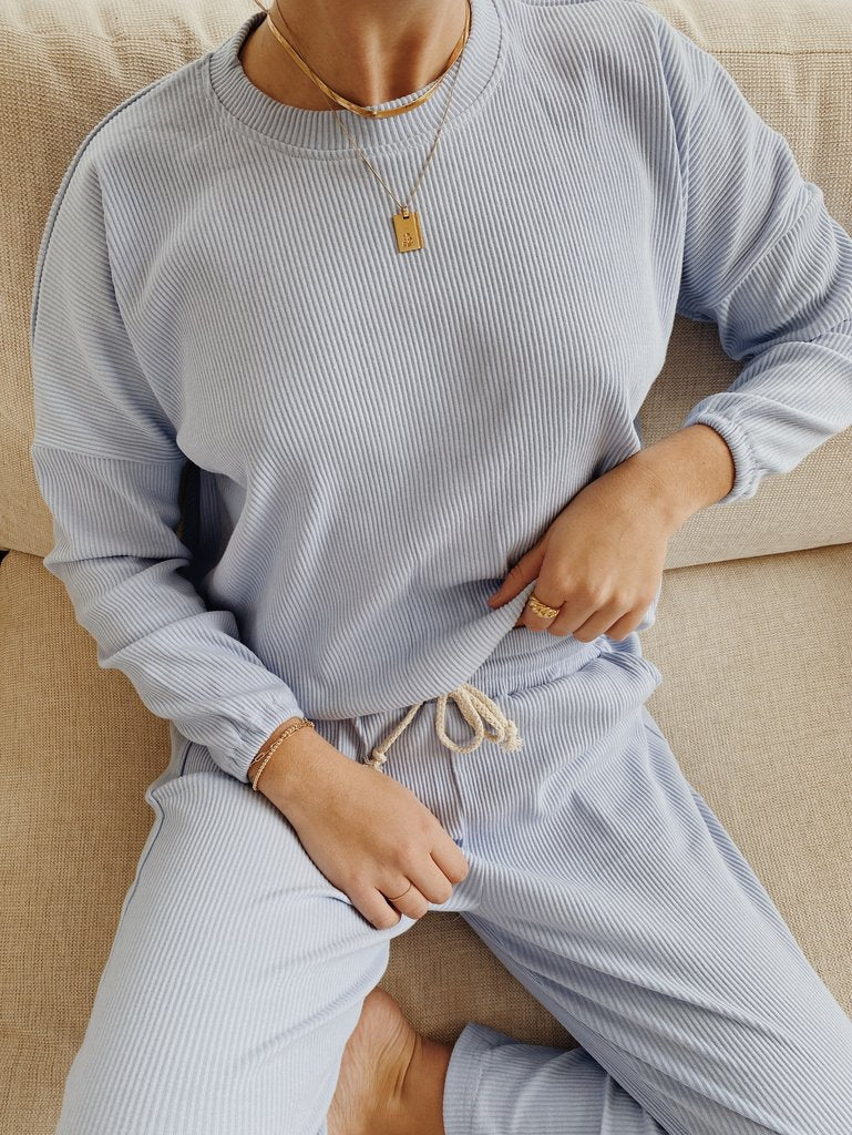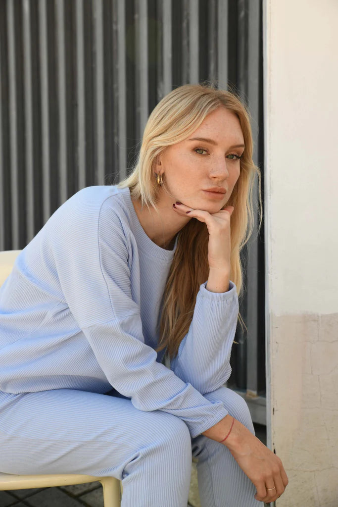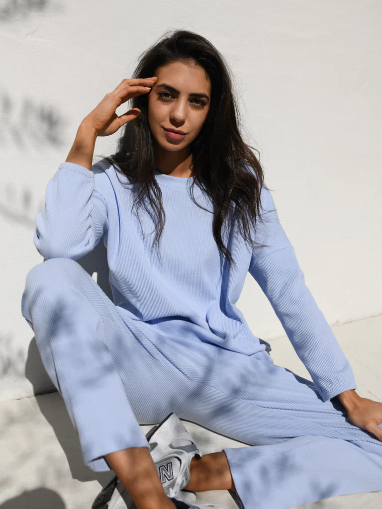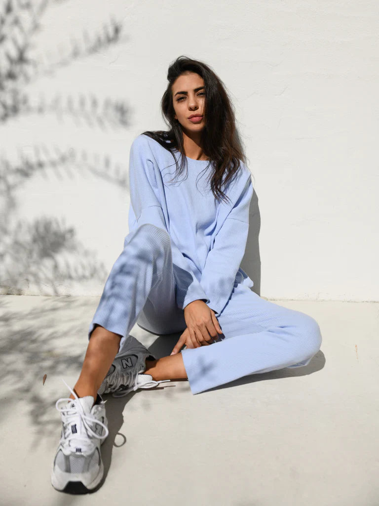 The Zaza Lounge Wear Set is a comfy 100% ribbed cotton pant and top.