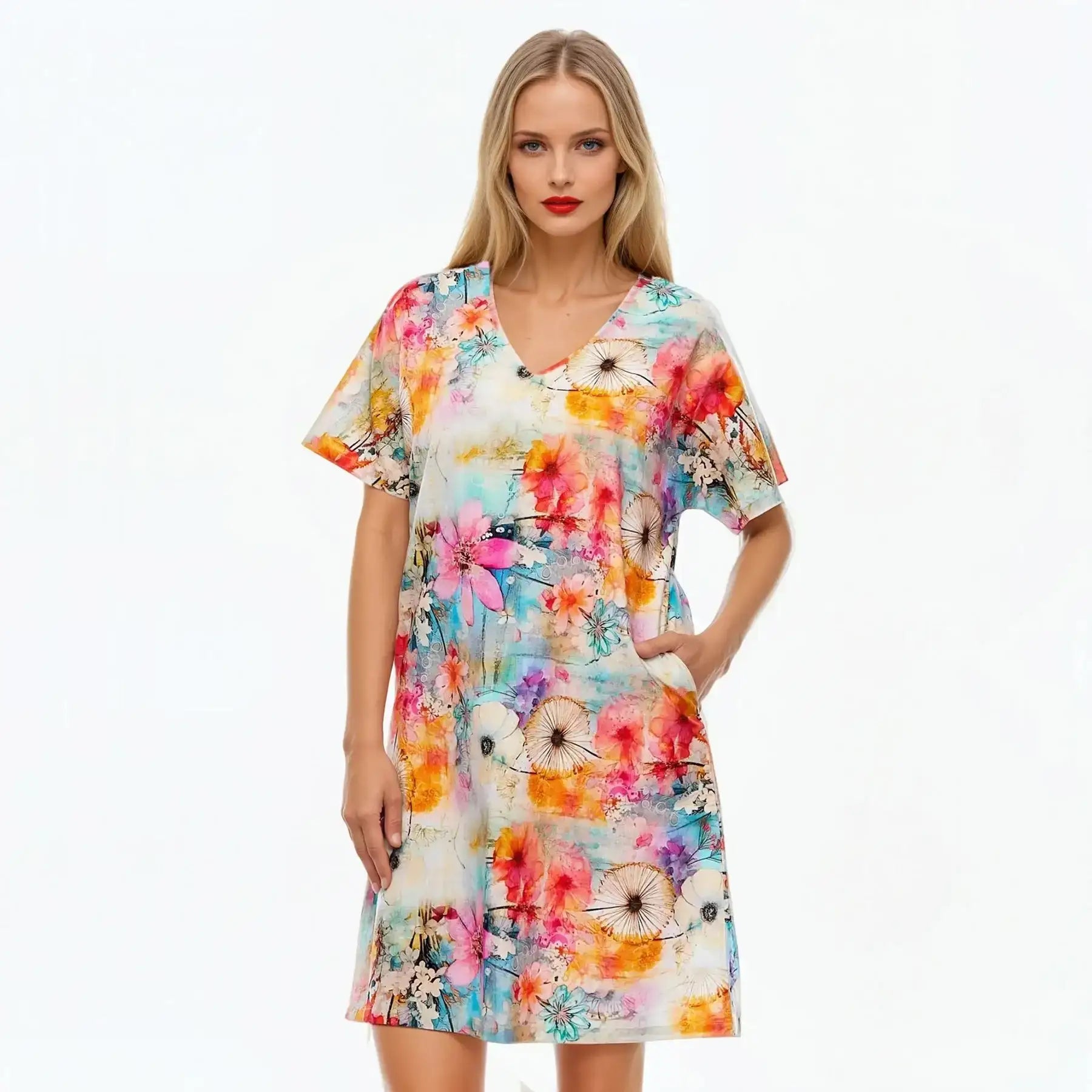 Designed with a relaxed yet flattering fit, the Zen Shift Dress allows vibrant colours to shine while maintaining an easy silhouette. The stylish V-neckline adds a touch of elegance, while short sleeves keep the look fresh, modern, and practical. Dress it up with heels for special occasions or keep it casual with flats for daytime outings—this versatile piece does it all.